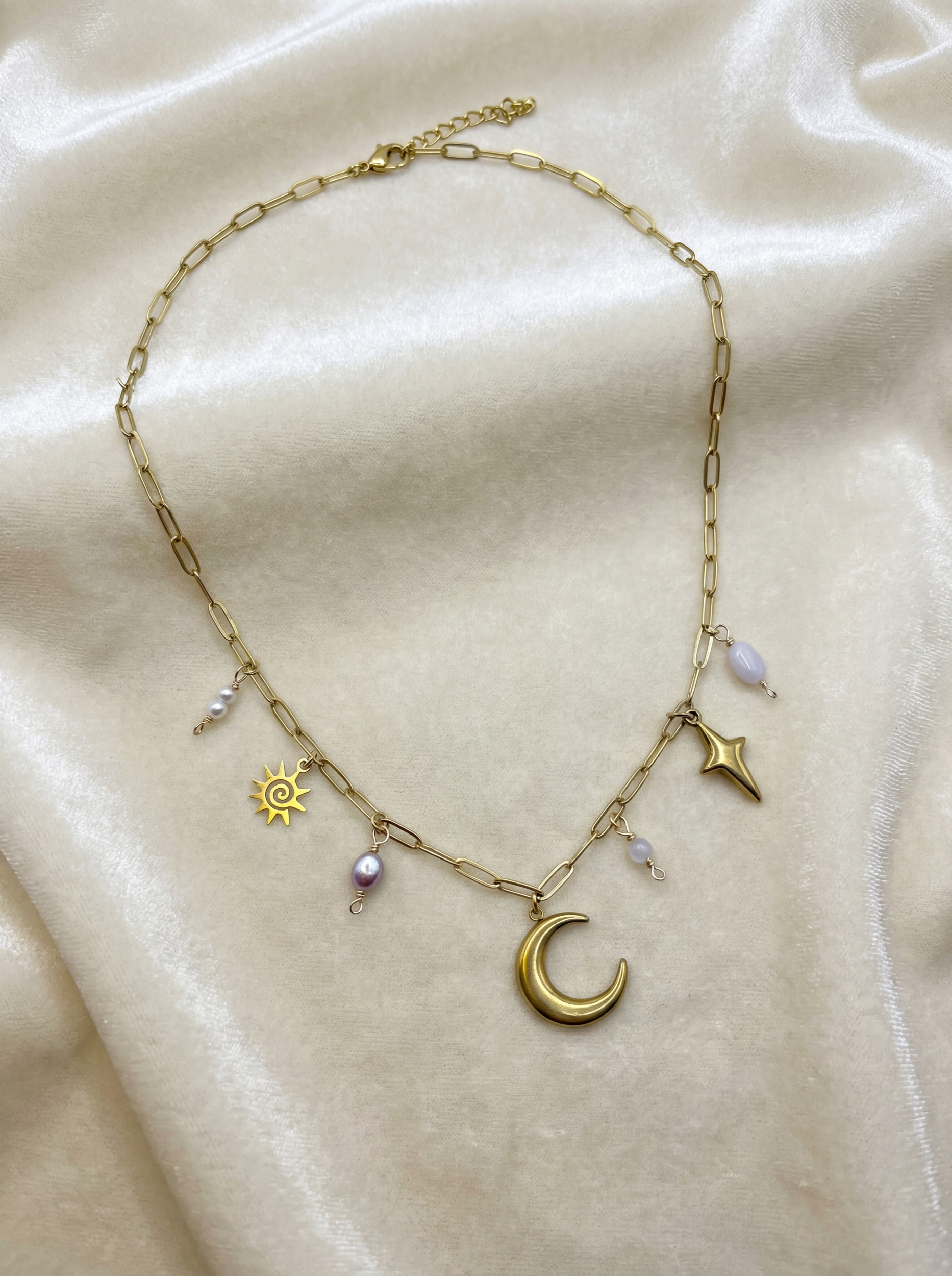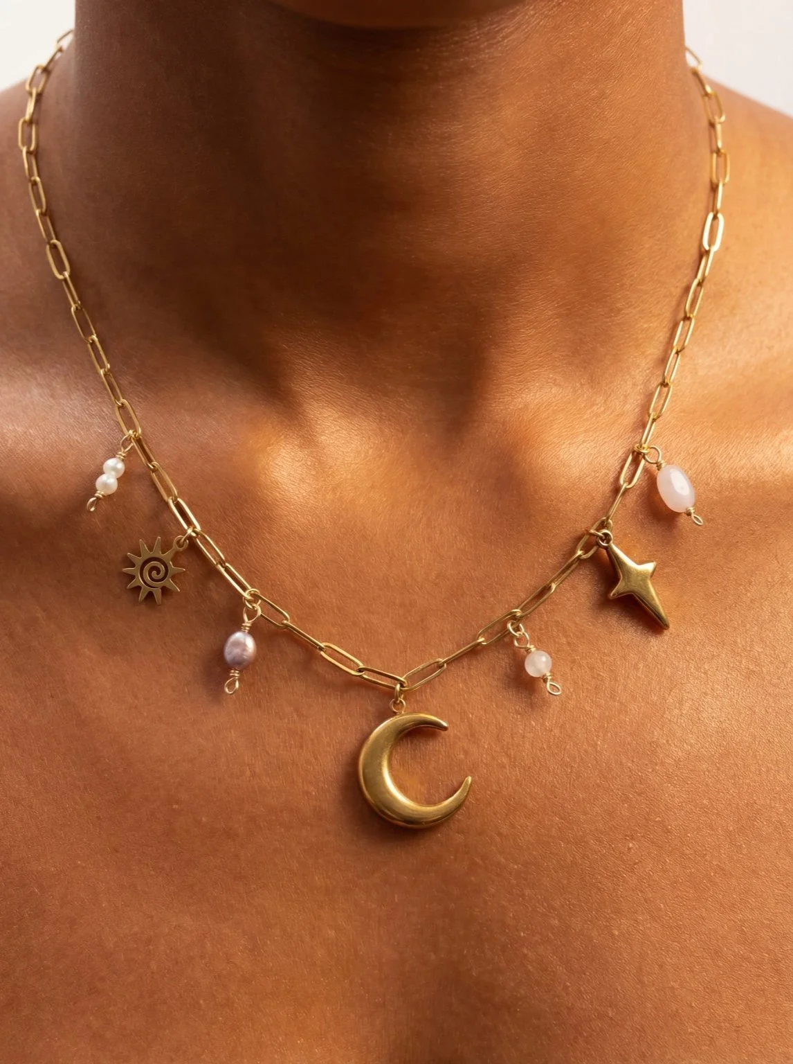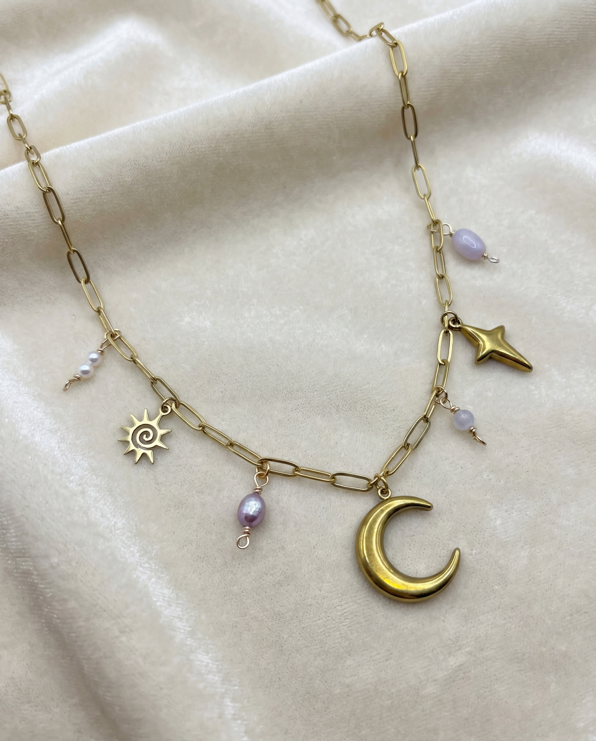 Each charm is hand-wrapped using 18k gold plated copper wire and selected for its natural beauty and symbolism. Rose Quartz is associated with unconditional love and emotional healing, while pearls symbolise grace, calm and emotional balance. The sun, moon and star represent guidance, intuition and light. Together, they create a necklace that feels nurturing, romantic and aligned with the universe.